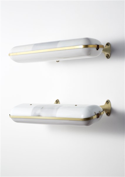 * Pair of wall lamps. Milan, 1957. Brass-cast aluminum structure, opaque white methacrylate diffuser. (l 73 cm.) (slight defects)