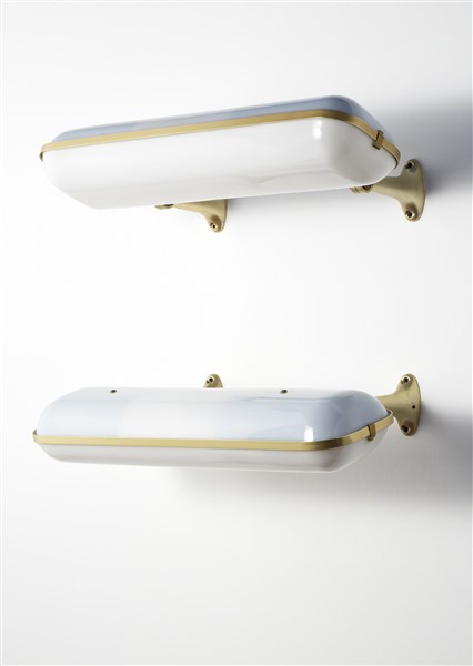 * Coppia di lampade da parete. Milano, 1957. Struttura in fusione di alluminio ottonato, diffusore in metacrilato bianco opaco. (l cm 73) (lievi difetti)