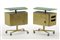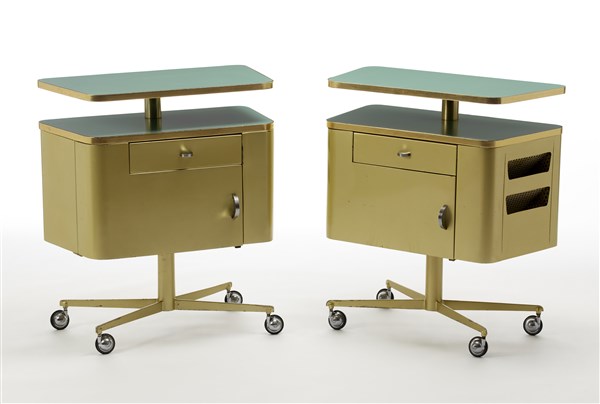 * Lotto di due comodini su ruote ad un cassetto, un'anta, due ripiani a giorno e una tasca porta riviste su un lato. Produzione Officine Valsecchi, Milano, 1957. Acciaio stampato e verniciato color verde metallizzato, piani rivestiti in formica verdina, bordure in alluminio ottonato. (cm 66x74,5x35,5) (lievi difetti)