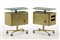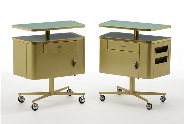 * Lotto di due comodini su ruote ad un cassetto, un'anta, due ripiani a giorno e una tasca porta riviste su un lato. Produzione Officine Valsecchi, Milano, 1957. Acciaio stampato e verniciato color verde metallizzato, piani rivestiti in formica verdina, bordure in alluminio ottonato. (cm 66x74,5x35,5) (lievi difetti e piccole mancanze)