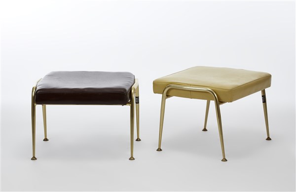 * Lot of two stools. Produced by Officine Valsecchi, Milan, 1957. Brass-plated aluminum legs, wooden structure and foam rubber seat covered in brown and ocher skai
