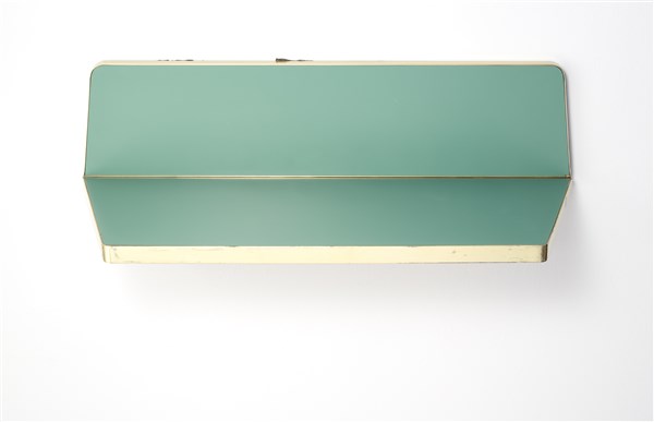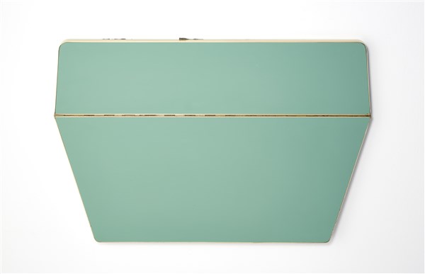 * Tavolo a parete pensile a ribalta. Produzione Officine Valsecchi, Milano, 1957. Struttura in legno, piano in formica verde bordato in alluminio ottonato. (cm 110x74,5) (lievi difetti)