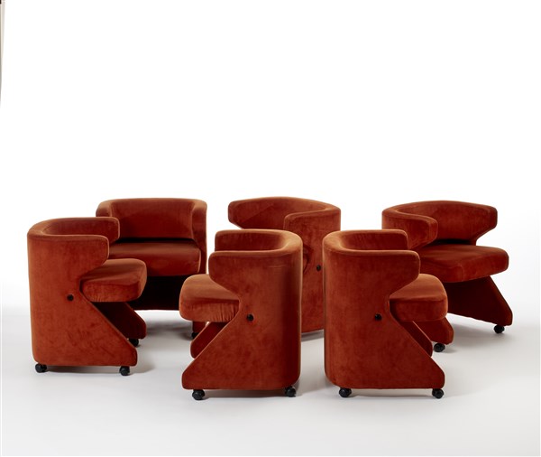 * Lotto di sei poltroncine modello "Poney". Produzione Formanova, Meda, 1970ca. Rivestimento in velluto color terra di siena. Struttura in metallo. Probabile sostituzione delle rotelle. (cm 58x67x50) (lievi difetti)