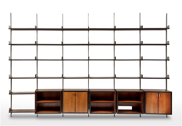 * Libreria modulare a sei campate con struttura in acciaio spazzolato, mensole e stipi in legno bordato e impiallacciato. Produzione Formanova, Meda, anni '70. (cm 435,5x288x47) (lievi difetti)