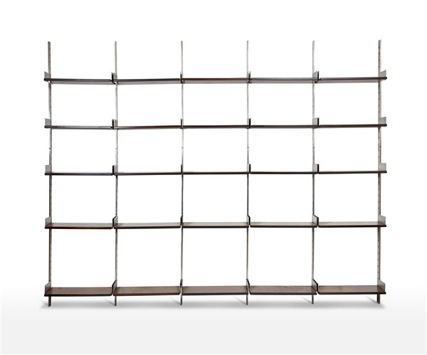 * Modular five-span bookcase with brushed steel structure, shelves in edged and veneered wood. Produced by Formanova, Meda, 1970s. (364x288x29.5 cm.) (slight defects)