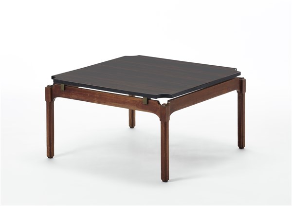 Coffee table. Italy, 1959ca. Solid mahogany structure, square top veneered in Indian rosewood, spacers in cast brass. (65x35x65 cm.) (slight defects)