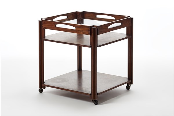 Trolley. Italy, 1959ca. Solid teak wood with two intermediate shelves and removable glass top. (60x65.5x60 cm.) (slight defects)