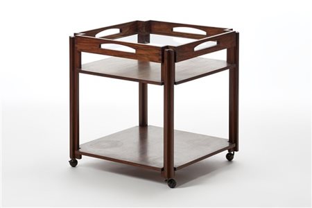 Carrello. Italia, 1959ca. Legno di teak massello a due ripiani intermedi e piano superiore asportabile in vetro. (cm 60x65,5x60) (lievi difetti)