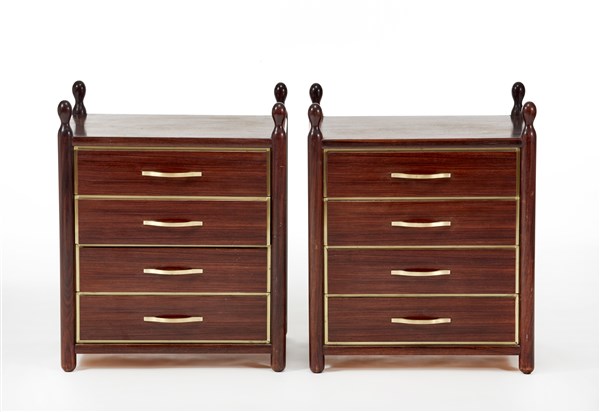 Coppia di comodini a quattro cassetti. Italia, anni '60. Legno di palissandro indiano, maniglie e profilature dei cassetti in ottone. (cm 60x72,5x40) (lievi difetti)