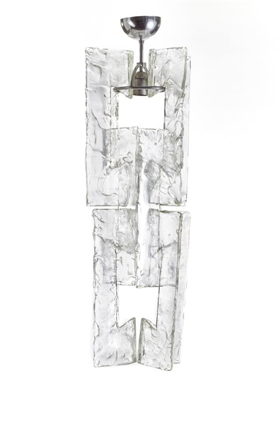 Suspension lamp. Italy, 1970s. Chromed metal structure, pendants in printed and corrugated Murano glass. (h 88 cm.; d 28.5 cm.)