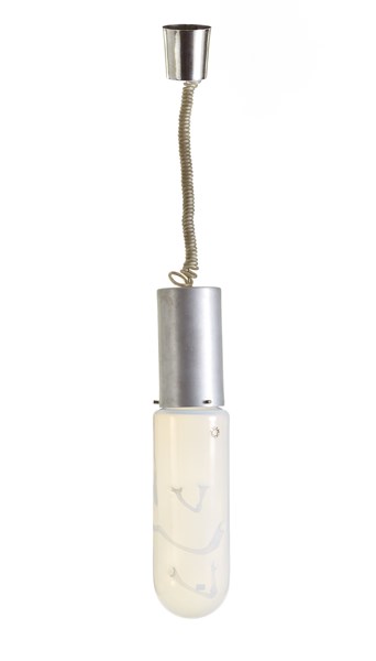 Lampada a saliscendi. Italia, anni '70. Struttura in alluminio, diffusore in vetro soffiato opalescente con membrane interne. Recante etichetta della produzione. (altezza regolabile)