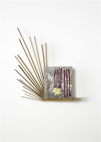 Lampada da parete modello "Mirko". Produzione Esperia, Italia, 1960ca. Scatola portalampadina in acciaio verniciato bianco, rivestimento e listelli in ottone, pannello in vetro corrugato trasparente incolore con inclusione di foglia d'oro e di elementi decorativi filiformi in vetro ametista applicati a caldo. (cm 55x58x10,5) (lievi difetti)
