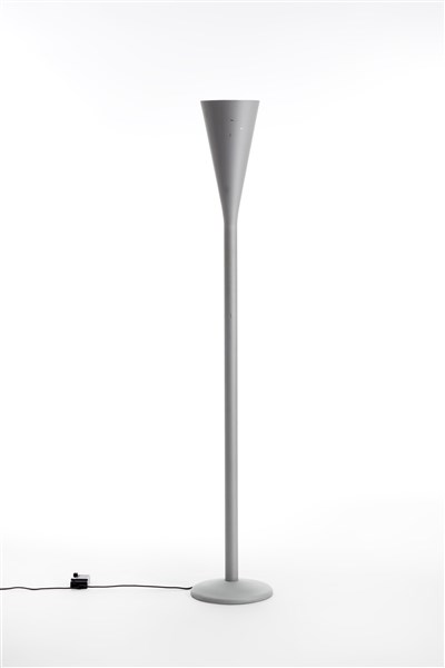 Lampada alogena da terra modello "Luminator". Produzione Fontana Arte, Milano, disegno del 1932, riedizione degli anni '90. Acciaio verniciato grigio micalizzato. Recante etichetta della produzione. (h cm 184,5) (lievi difetti)