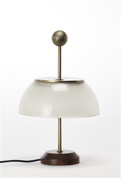 Lampada da tavolo modello "Alfa". Produzione Artemide, Milano, 1960. Ottone nichelato, vetro stampato e base in palissandro indiano massello. (h cm 48; d cm 30) (lievi difetti)