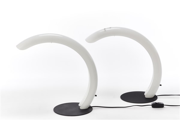 Pair of arched table lamps. Murano, 1970s/1980s. Corrugated black painted metal base, white painted brass structure and lattimo incamiciato glass diffuser. Bearing adhesive label. (h 42 cm.)
