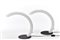 Coppia di lampade da tavolo ad arco. Murano, anni '70/'80. Base in metallo verniciato nero corrugato, struttura in ottone verniciato bianco e diffusore in vetro incamiciato lattimo. Recante etichetta adesiva. (h cm 42)