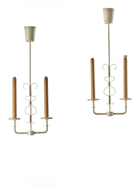 Pair of two-flame ceiling lamps. Milan, 1940s. Pearly white and ocher painted metal. Bearing manufacturer's label. (h 92 cm.) (slight defects)