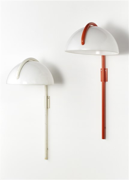Lotto composto da due lampade da parete modello "Serpente". Produzione Martinelli Luce, Lucca, anni '70. Metallo verniciato bianco e arancione e perspex opalino. (h cm 103; d cm 45,5) (lievi difetti)