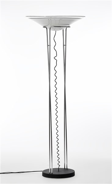 Lampada da terra. Italia, anni '70. Base in ghisa, struttura in tubolare di acciaio cromato, diffusore troncoconico in vetro soffiato incamiciato lattimo e trasparente incolore. (h cm 169)