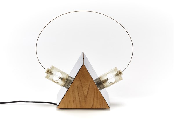Lampada da tavolo. Produzione Sormani, Italia, 1971. Acciaio cromato, rovere, acrilico, magneti, filo d'acciaio. Marcata sotto la base. (cm 26,5x25x12,5) (lievi difetti e modifiche)