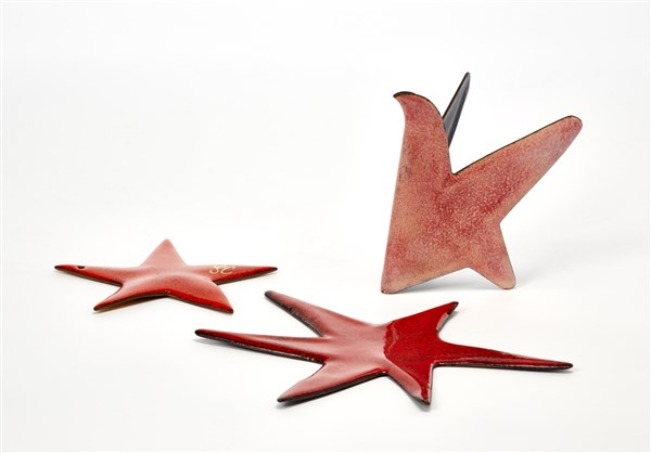 Lotto composto da tre sculture in rame smaltate nei toni del rosso, del rosa, e del blu di cui due firmate De Poli al verso. Padova, anni '80. (misure diverse) (lievi difetti)