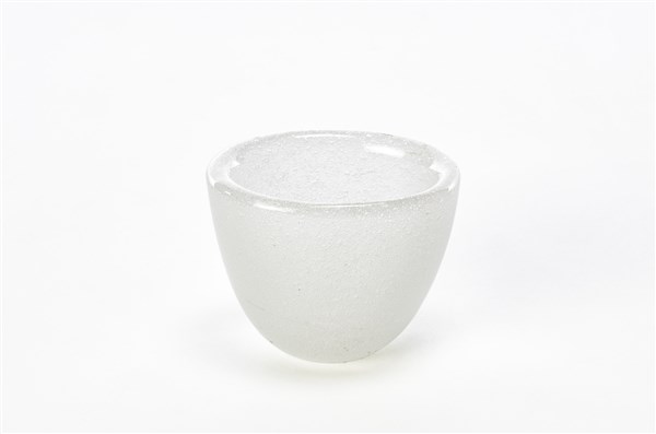 Coppetta a sezione ovale e corpo svasato in vetro trasparente incolore a bollicine. Murano, anni '50. Firmata all’acido "venini murano" sotto la base. (h cm 6,5)