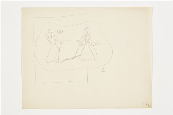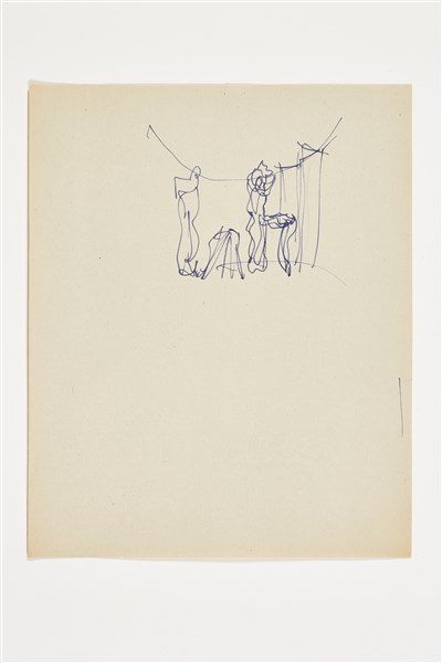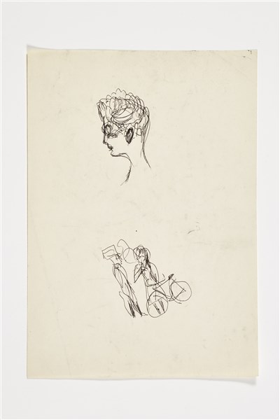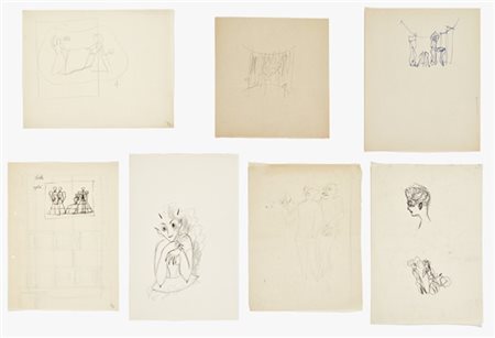 Miscellany of seven sketches of different subjects and epochs dating back to the 1930s and 1950s.. Pencil, black ink and blue ink on paper. (different sizes in the order of A4 format or less) (slight defects)