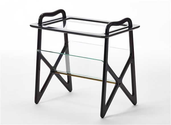Magazine rack in solid mahogany wood structure, removable tray and inclined glass shelves. Italy, 1950s. (60x57.5x40 cm.) (slight defects)