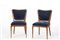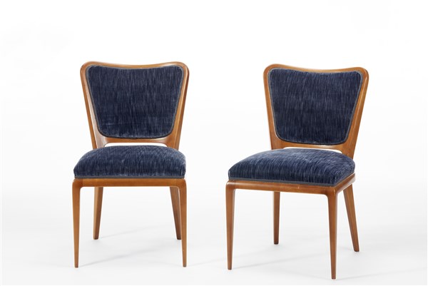 Coppia di sedie corrispondenti alla poltroncina modello "5700". Borsani, Varedo, 1941ca. Struttura in legno di ciliegio massello, seduta e schienale imbottiti e rivestiti in velluto blu. (cm 48x82x57) (restauri)