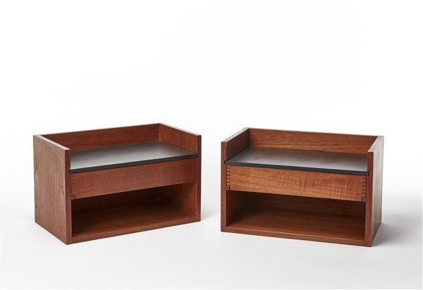 Due comodini pensili ad un cassetto e un vano a giorno variante del modello "CD26 Comodino". Esecuzione Poggi, Pavia, 1960ca. Legno di teak impiallacciato e bordato, interno del cassetto in formica e piano in marmo nero di Lavagna. Produzione fuori serie. (cm 40x25,5x23) (lievi difetti)