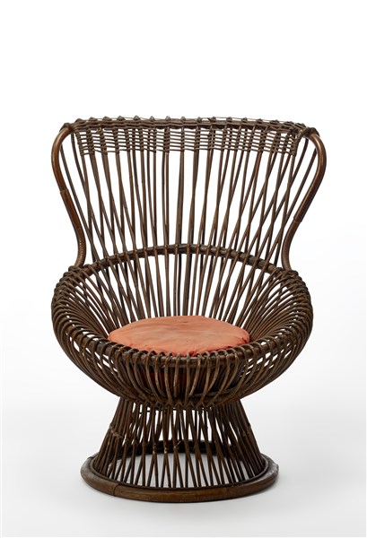 Poltrona modello "Margherita". Esecuzione Vittorio Bonacina, Lurago d'Erba, 1951. Malacca e canna d'India, cuscino imbottito rosso. Premio Medaglia d'oro alla IX Triennale di Milano. (cm 77x94x86) (difetti e manomissioni)