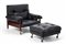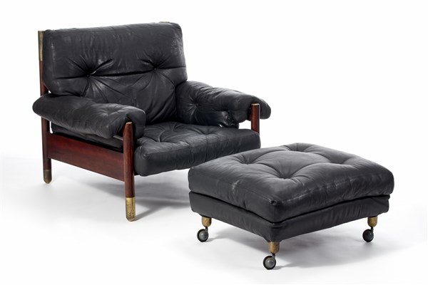 Poltrona con poggiapiedi modello "Sella". Produzione Sormani, Italia, 1960ca. Struttura in legno massello di palissandro indiano, terminali in ottone, rivestimento in pelle nera. (poltrona cm 100x80x85; pouf cm 70x37x60) (difetti)