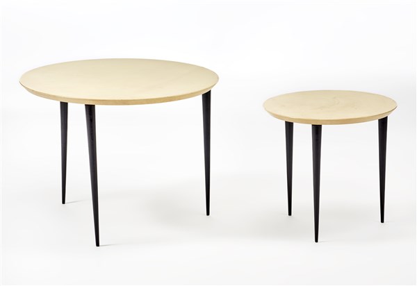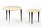 Two tripod coffee tables. Lazzate, 1950s/1960s. Legs and wooden top with white parchment covering. Bearing paper labels under the tops. (h 45 cm. d 60 cm; h 38 cm. d 40 cm) (slight defects)