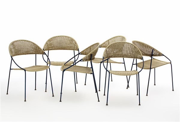 Lotto di sei sedie da esterno modello "DU41". Produzione Rima, Padova, 1956. Struttura in tondino metallico verniciato blu, seduta e schienale in corda sintetica intrecciata. (cm 57x80x57) (lievi difetti)