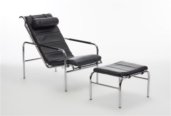 Chaise longue regolabile su due posizioni con poggiapiedi modello "920 Genni". Produzione Zanotta, Nova Milanese, disegno del 1935, riedizione degli anni '80. Tubolare in acciaio cromato, cuscini e braccioli in pelle nera. Marcati i cuscini. (poltrona: cm 58x82x105; poggiapiedi: cm 55x37x45)