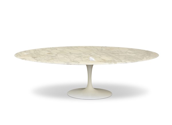 Tavolo modello "Tulip". Probabile produzione Knoll International. USA, anni '70. Piedistallo in fusione di alluminio laccato bianco; piano in marmo bianco venato rivestito in resina al poliestere. (cm 244x74x136,5) (difetti alla resina)