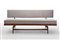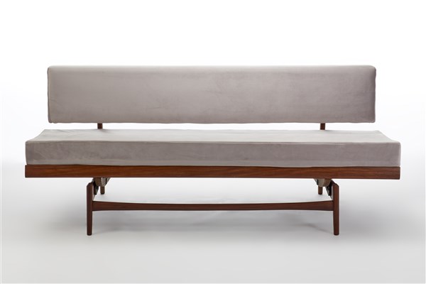 Divano-letto con struttura in legno massello di teak, seduta e cuscini imbottiti e rivestiti in velluto grigio. Probabile produzione nord-europea. Anni '50/'60. (cm 190x77x86) (restauri)