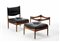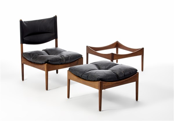 Lotto composto da un tavolino, una poltroncina con pouf con struttura in legno di teak massello e cuscini imbottiti e rivestiti in pelle nera. Danimarca, anni '50. Recante etichetta cartacea sotto la seduta del pouf. (poltrona cm 55x77x55; puof e tavolino cm 55x32x55) (difetti e mancanza del piano del tavolino)