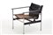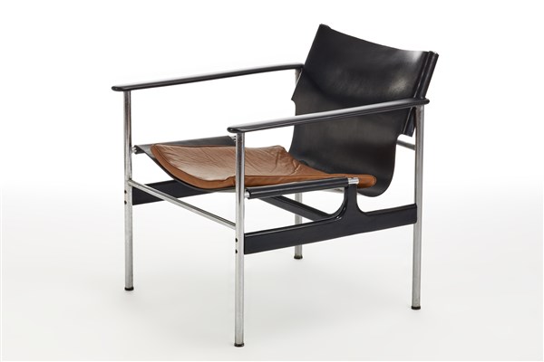 Poltrona modello "657". Produzione Knoll International, Usa, Disegno degli anni 70, esemplare degli anni '90. Struttura in acciaio cromato e nero, seduta e schienale in pelle nera, cuscino in pelle marrone. (cm 62x68x58) (lievi difetti)