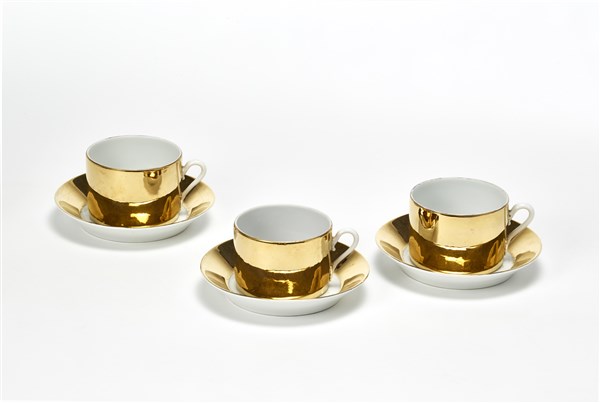 Servizio da te composto da tre tazze e tre piattini della serie "Oro ". Milano, anni '60. Porcellana dorata e bianca. Marcato sotto la base. (lievi difetti)