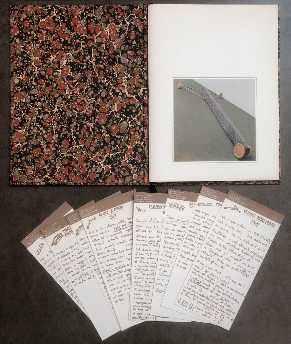 Sulla terza di copertina è incollata una busta contenente 12 schede con il progetto di altrettanti lavori dell’artista.