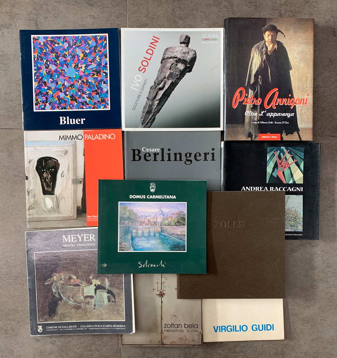 Lotto unico di 11 cataloghi relativi ai seguenti artisti: Cesare Berlingeri, Mimmo Paladino, Virgilio Guidi, Ivo Soldini, Pietro Annigoni, Zoltan Bela, Bluer, Giovanni Schiaroli, Meyer, Andrea Raccagni, Zolle