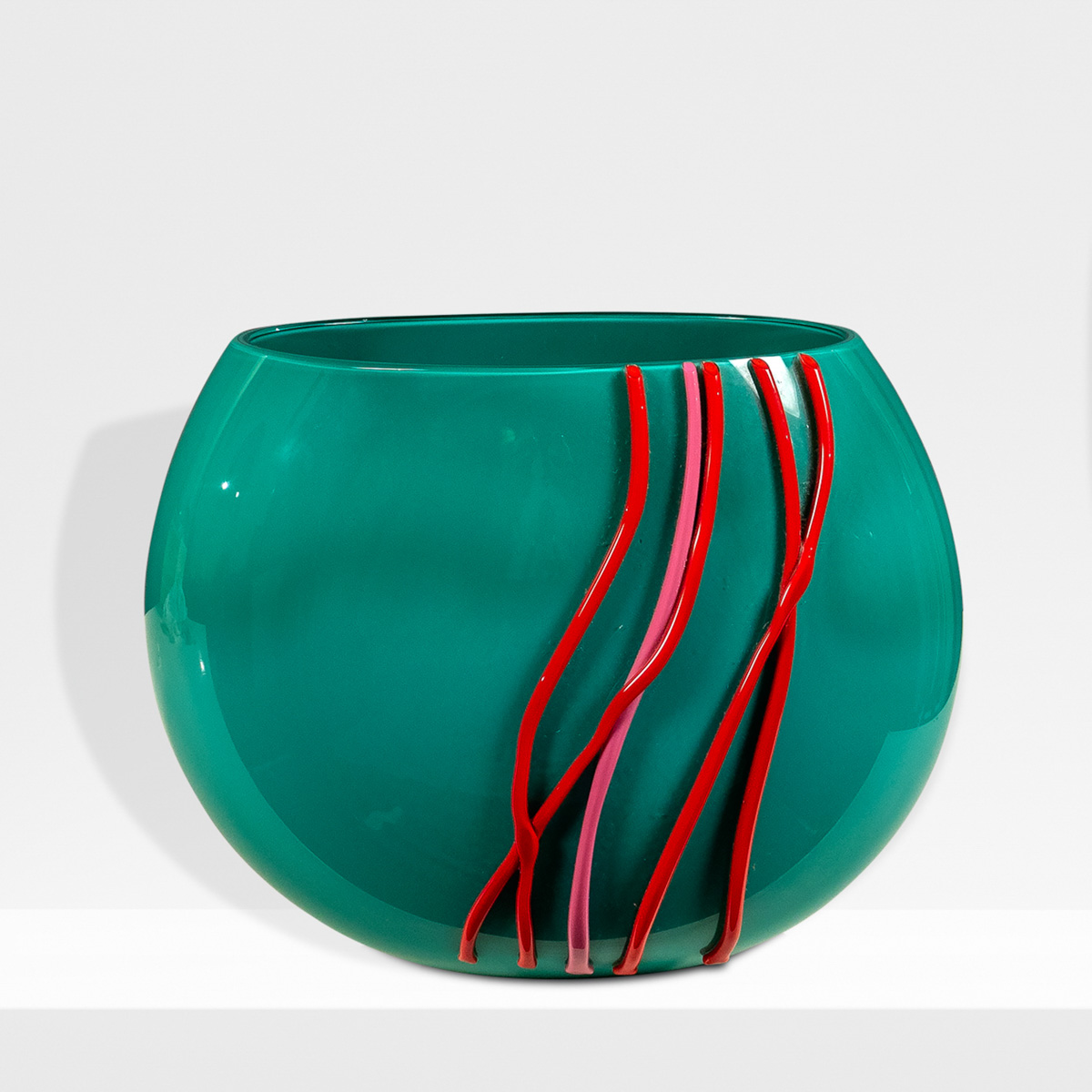 Gianni Versace, prod. VeniniMurano 200023x21x14,5 cm.vaso Rave vaso in vetro opalino verde con applicazioni in vetro rosso e lavanda, firma a punta Venini Versace 2000 sotto la base, etichetta originale