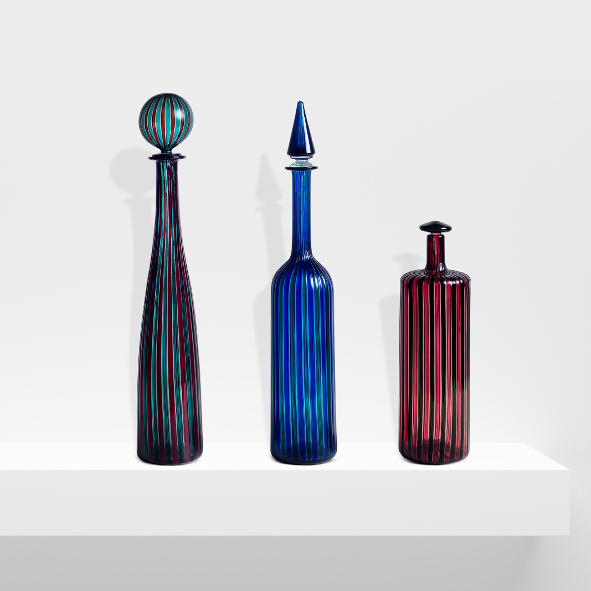 tre bottiglie serie Morandiane in vetro soffiato a canne alternate, firma a punta Venini Italia 1981, vecchie etichette