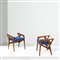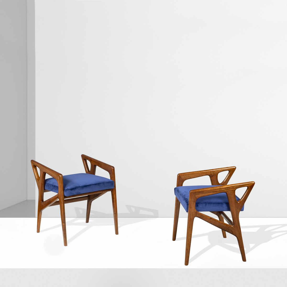 Gio Ponti (2)Italia, anni 5054,5x47x53 cm.coppia di sgabelli in legno di noce, tessuto imbottito