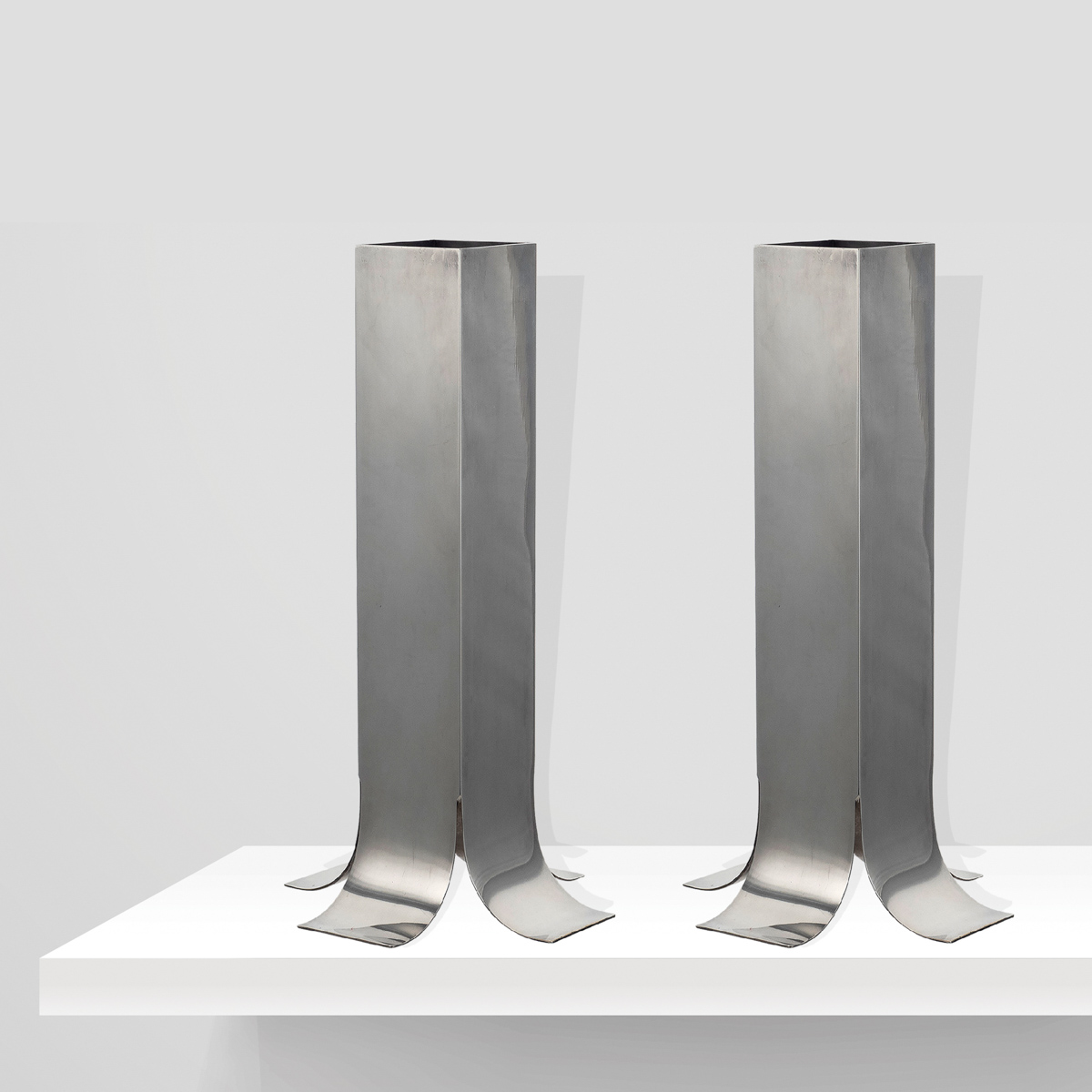 Lino Sabattini (2)Italia, anni 7031x16x16 cm.coppia di vasi in metallo argentato, marchio sotto le basi