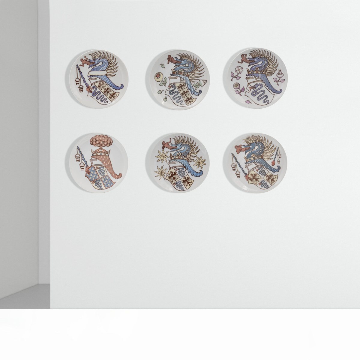 Piero Fornasetti (6)1970 circad. 25 cm.sei piatti in porcellana, serie Iconografia degli stemmi viscontei per l'Alfa Romeo, titolo della collezione e marchio del produttore sotto la base, usure