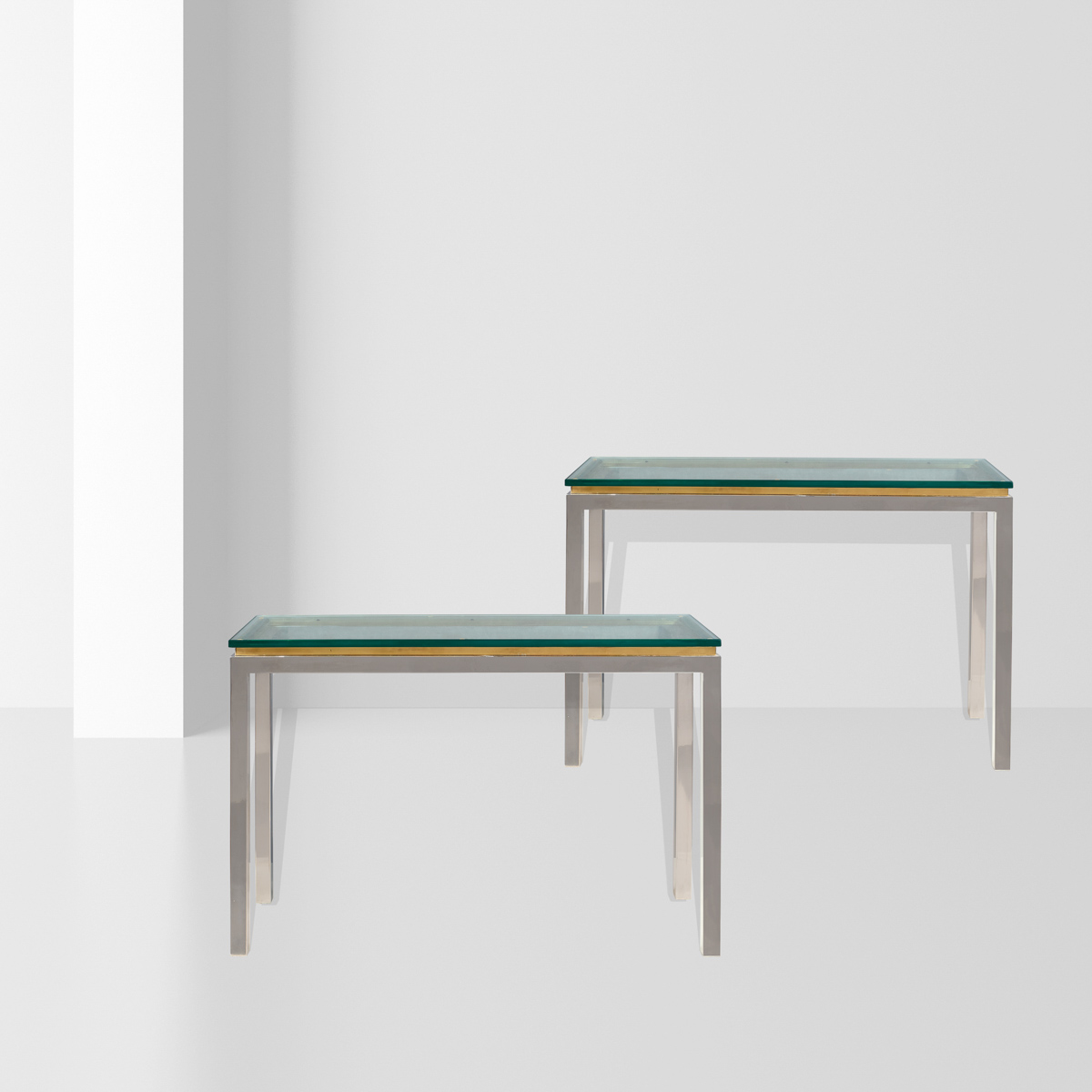 Willy Rizzo (2)Italia, anni 7078x110x40 cm.coppia di console acciaio, acciaio dorato, piani rettangolari in cristallo
