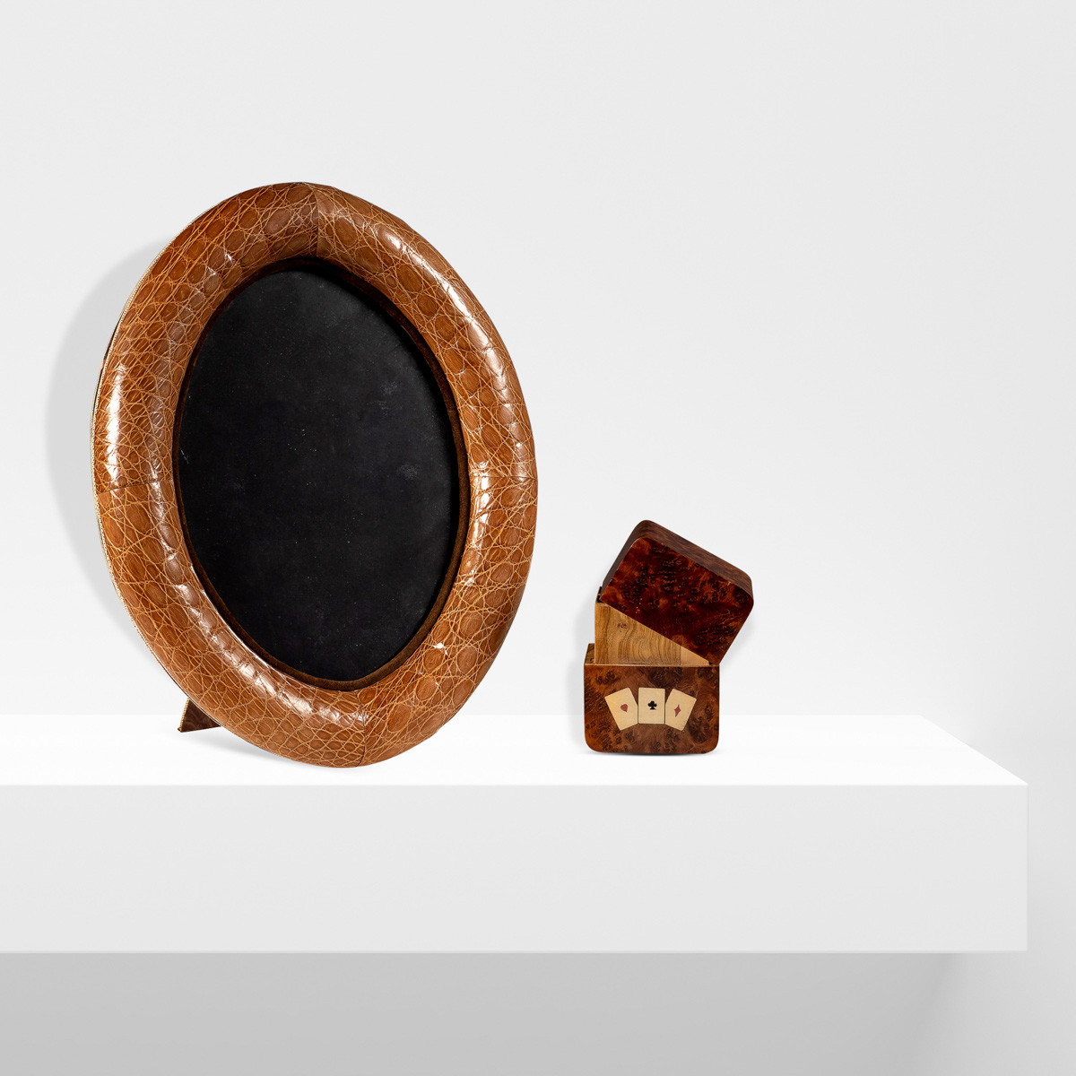 Gruppo di oggetti (2)XX Sec.40x32- 12x9x5 cm.composto da una cornice portafoto in pelle e una scatola portacarte in radica