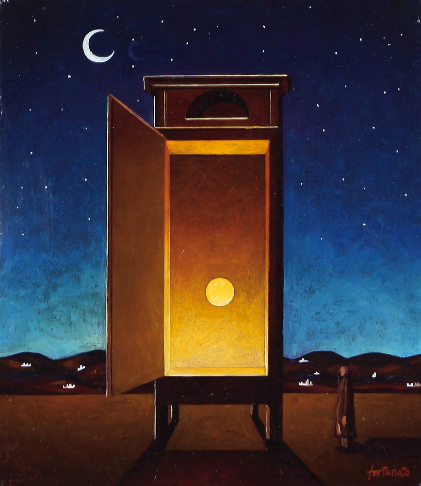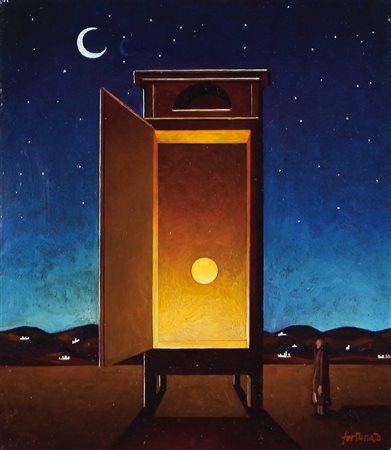 FRANCO FORTUNATO Roma 06/12/1946 Il cercatore di tramonti olio su tela cm. 40x35, firma in basso a destra, titolo e firma al retro, dichiarazione d'autenticità dell'artista su foto.